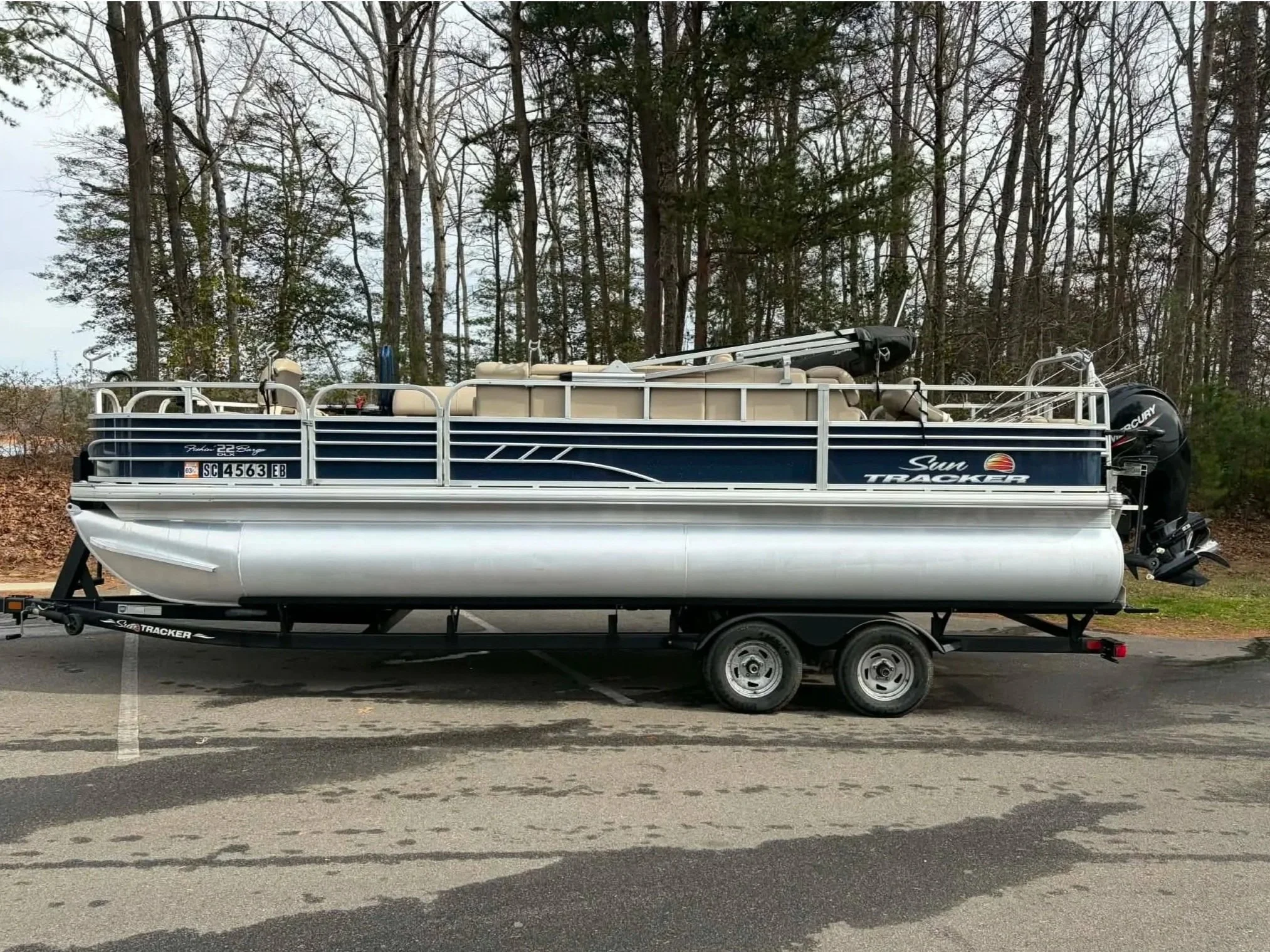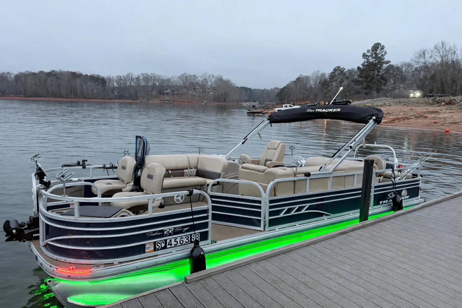 Our pontoon is a 22 foot Tracker fishing barge that is equipped with dual Garmin fish finders, 2 live wells, comfortable seating for up to 6 people and a canopy top for those sunny or rainy days! Adult and kid life jackets are always on board.
